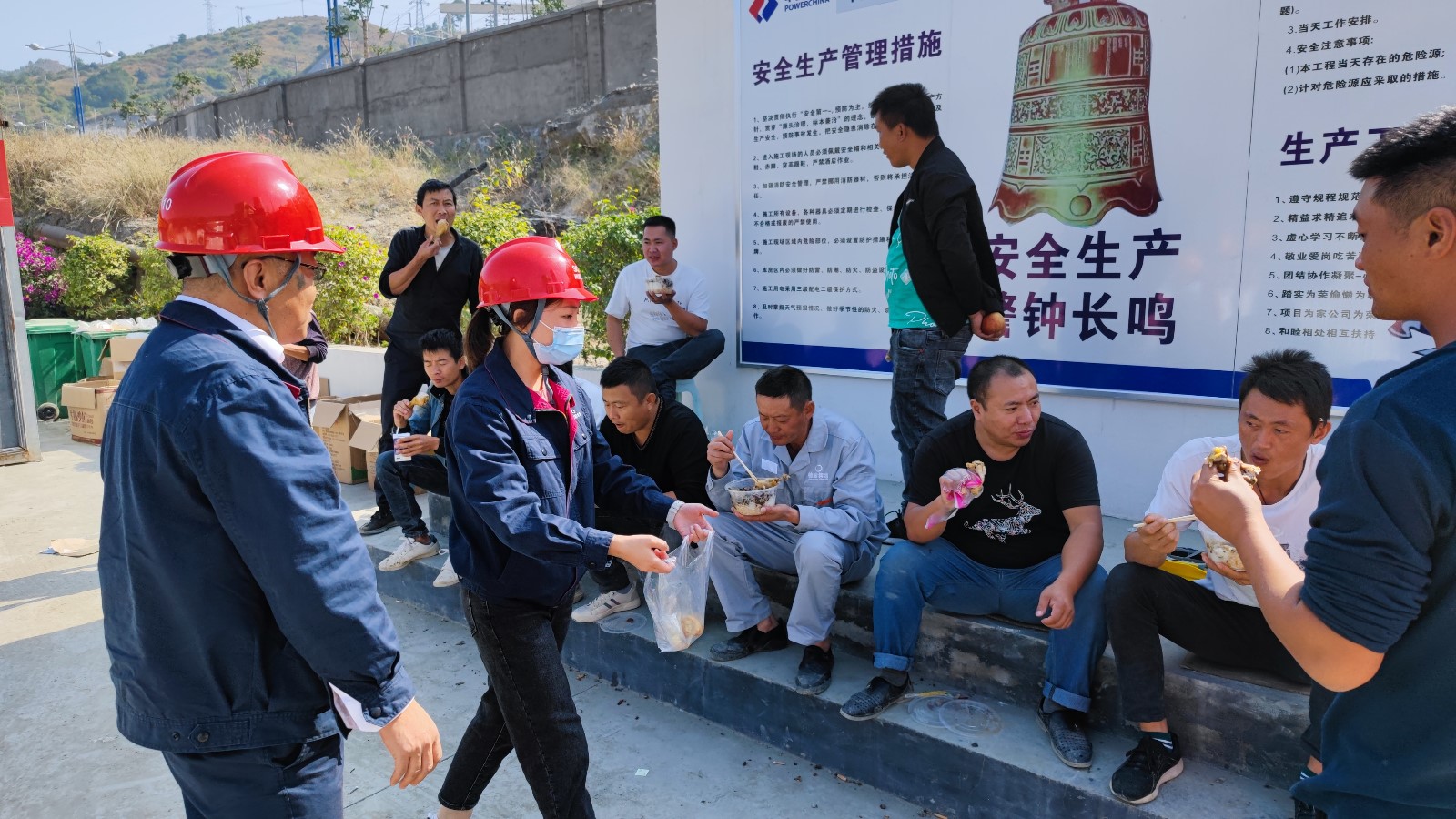 通过克日对施工班组的相识,为确保大江截流的目的按期实现,工人们中午、晚上用餐都是送到施工现场简朴解决,11月9日,机关第一党支部组织了以“工人在加班,我为工人送加餐”的主题党日活动,组织支部党员、准备党员、入党起劲分子、自愿服务者共15人到导流明渠施工现场,慰问在施工现场加班加点的一线工人,为他们送去了鸡腿、苹果等慰问品。